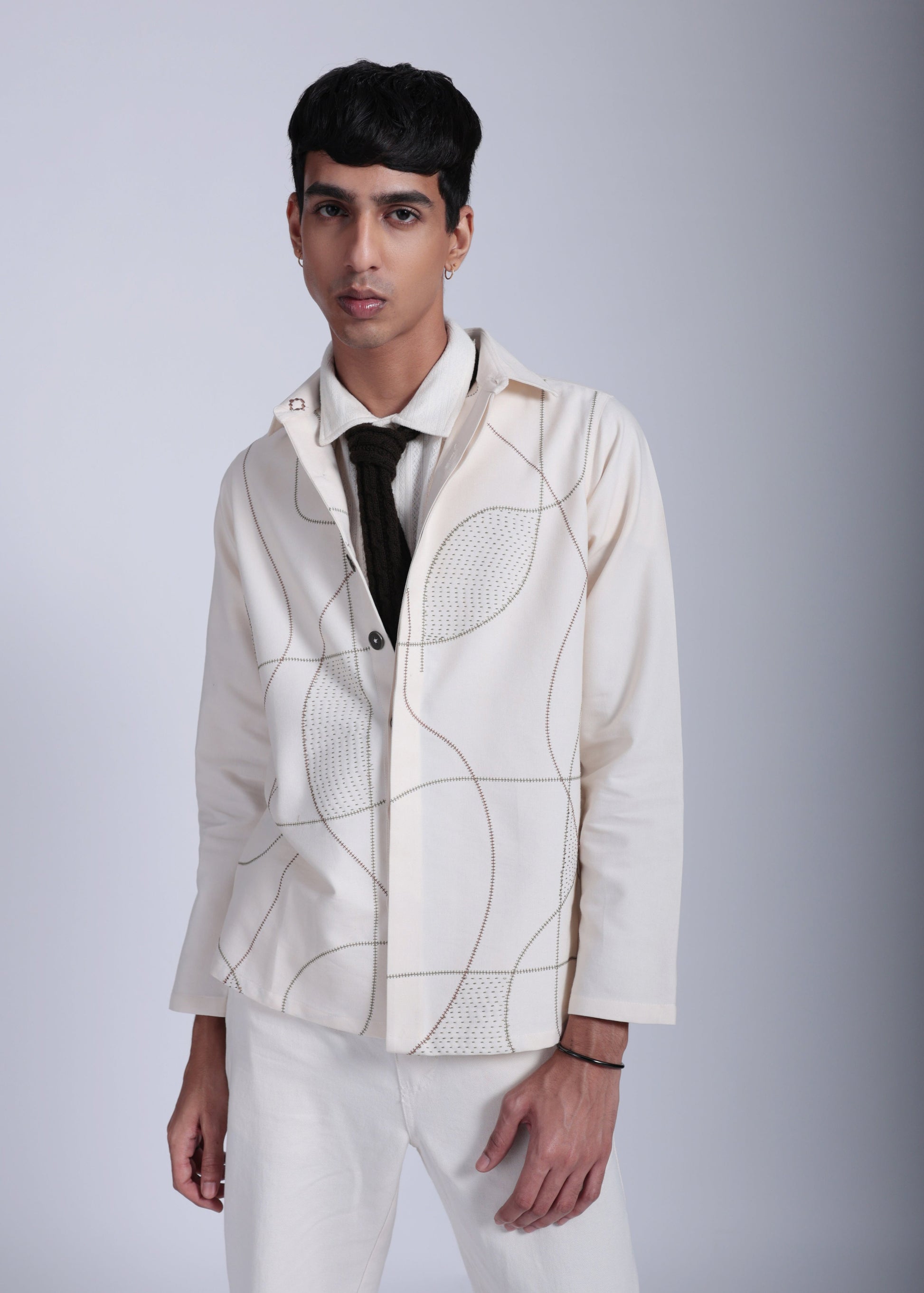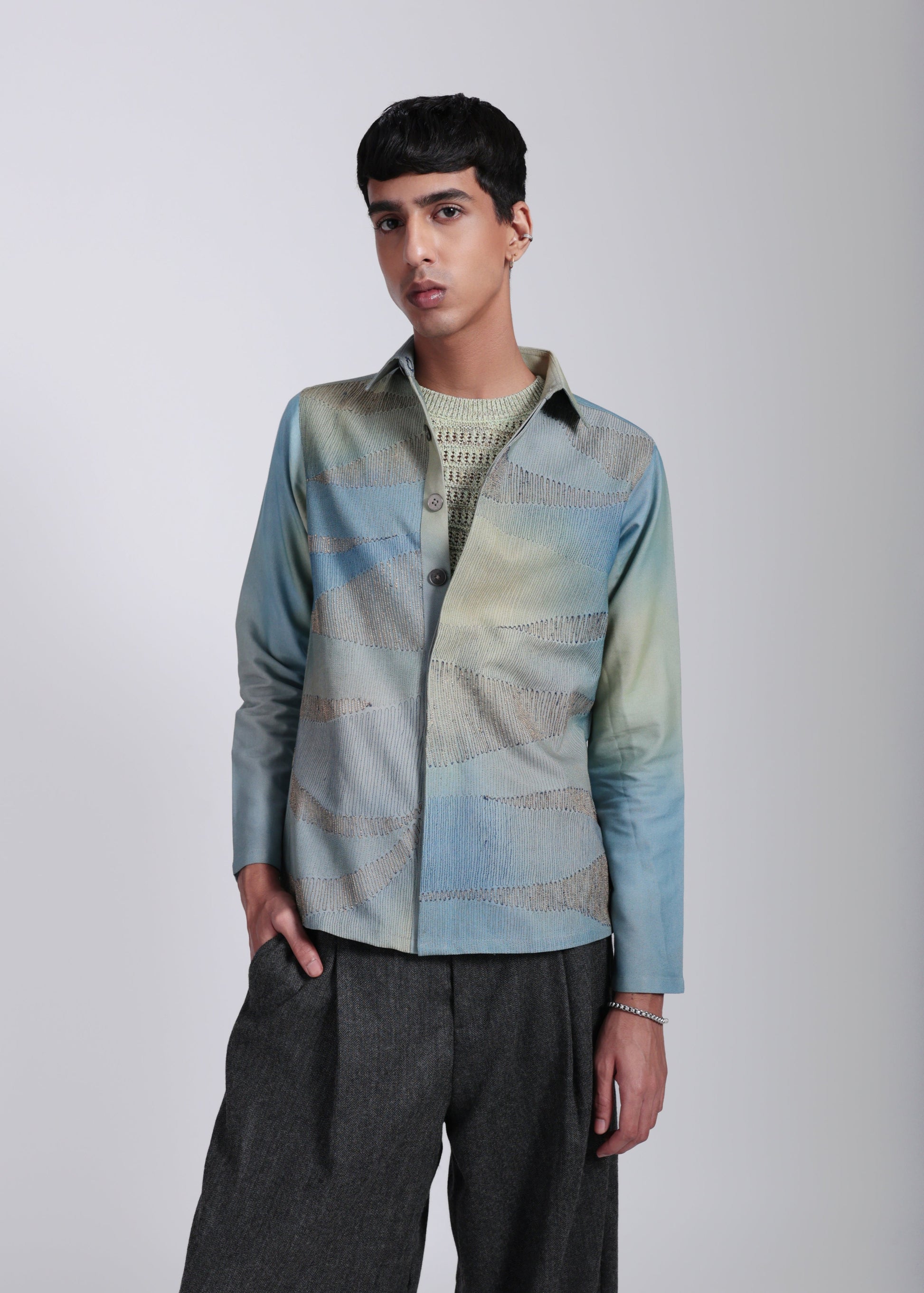 The Celestial Chroma Shacket reflects the night sky in fabric form—mystical, deep, and endlessly versatile. Pair it with denim for a casual look or trousers for smart layering.