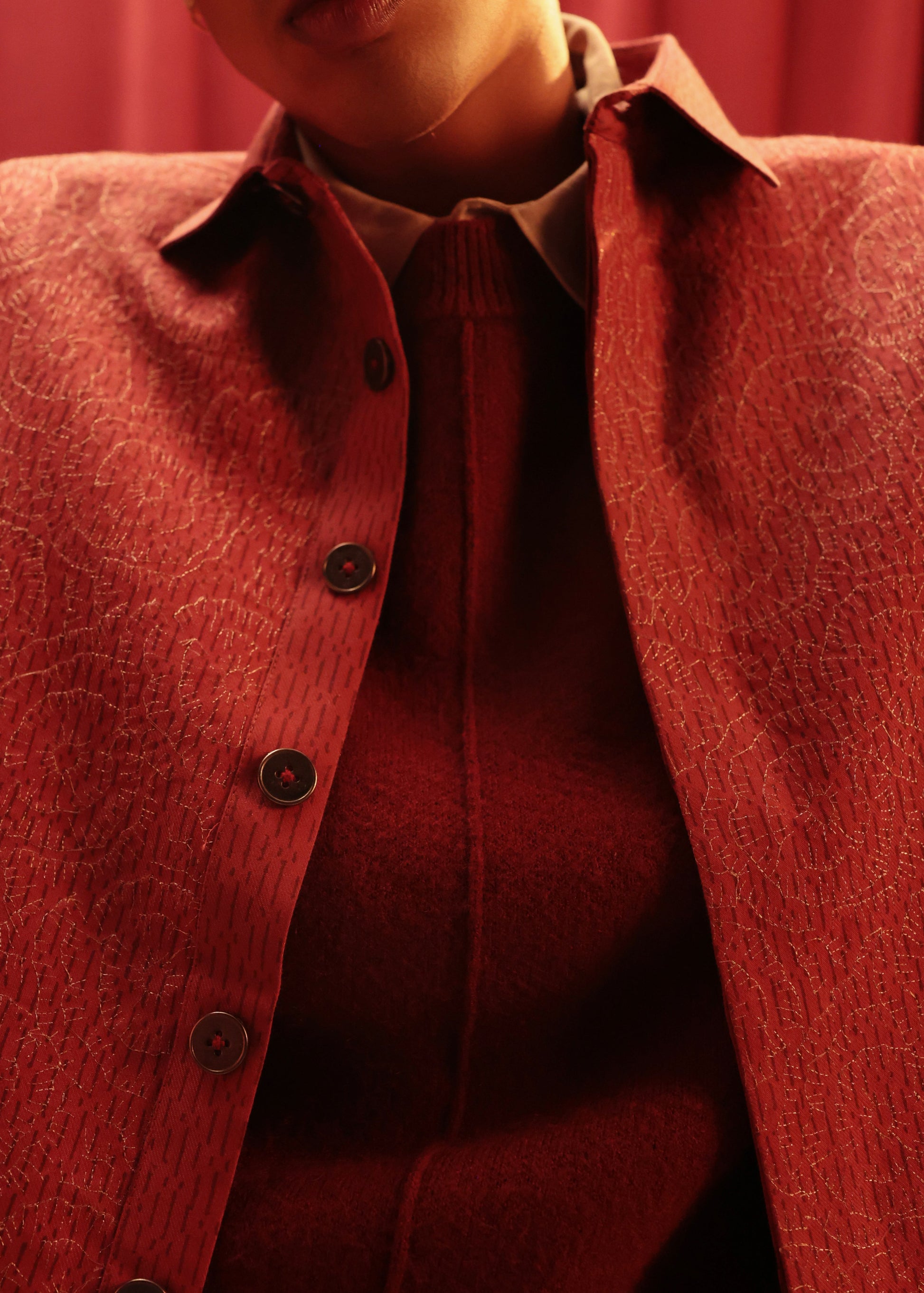Bold yet balanced, the Scarlet Gleam Shacket brings depth to winter evenings. Its red tone is commanding but crafted to feel sophisticated rather than overpowering.