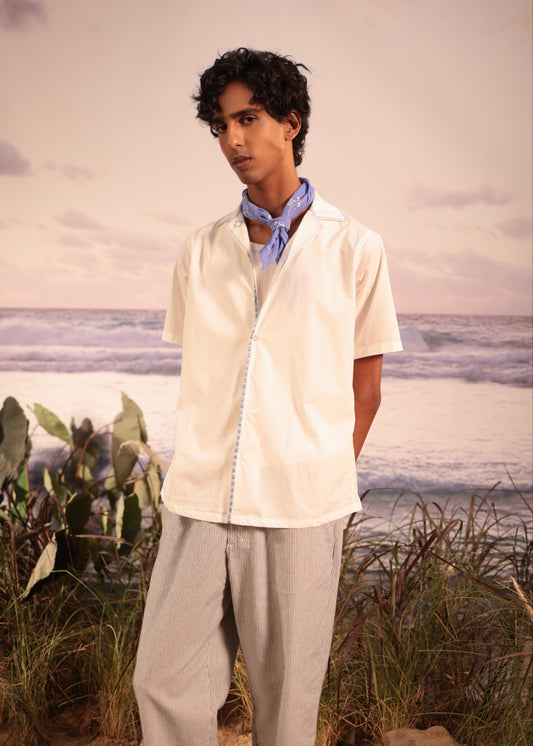 | resort brunch | santorini sky shirt + white cotton trousers + leather sandals | breathable and blue-toned—sunlight makes the appliqué pop |