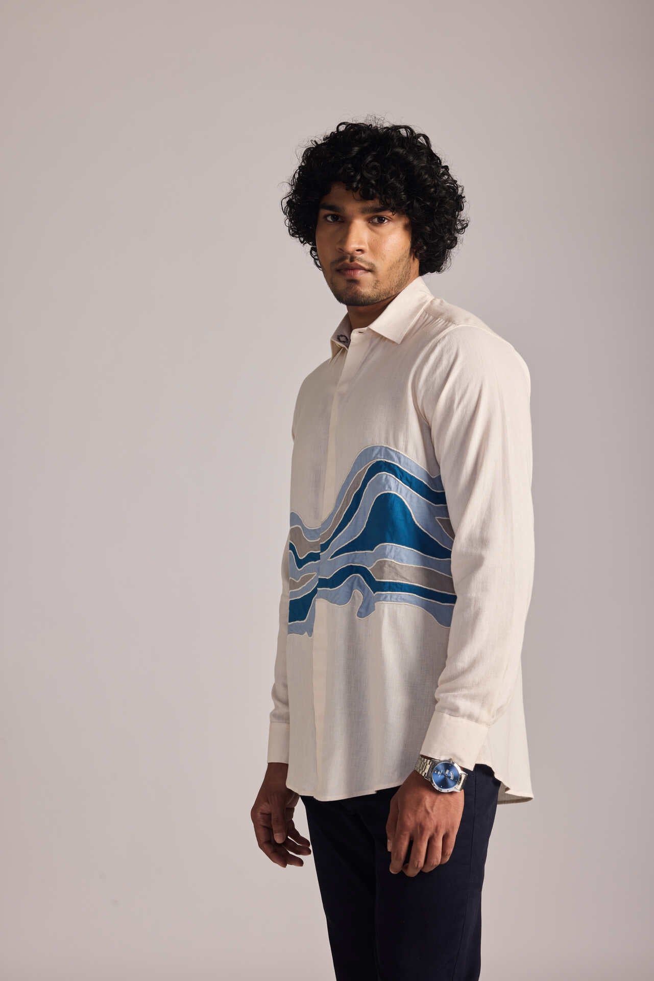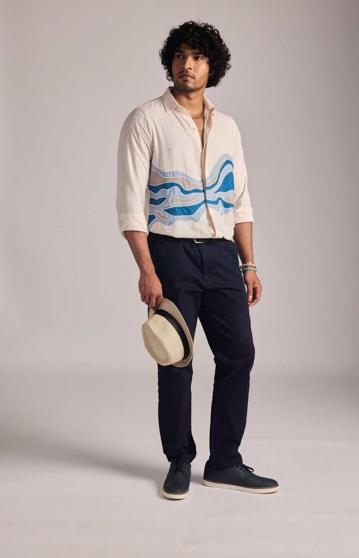 THE Bora Bay Shirt crafted from cotton linen instantly takes you to the serene and sophisticated beauty of Bora Bora. The name evokes a sense of tranquillity and luxury, aligning with the intricate wave applique on the shirt. Perfect for making a statement, this design captures the essence of timeless elegance and oceanic allure.