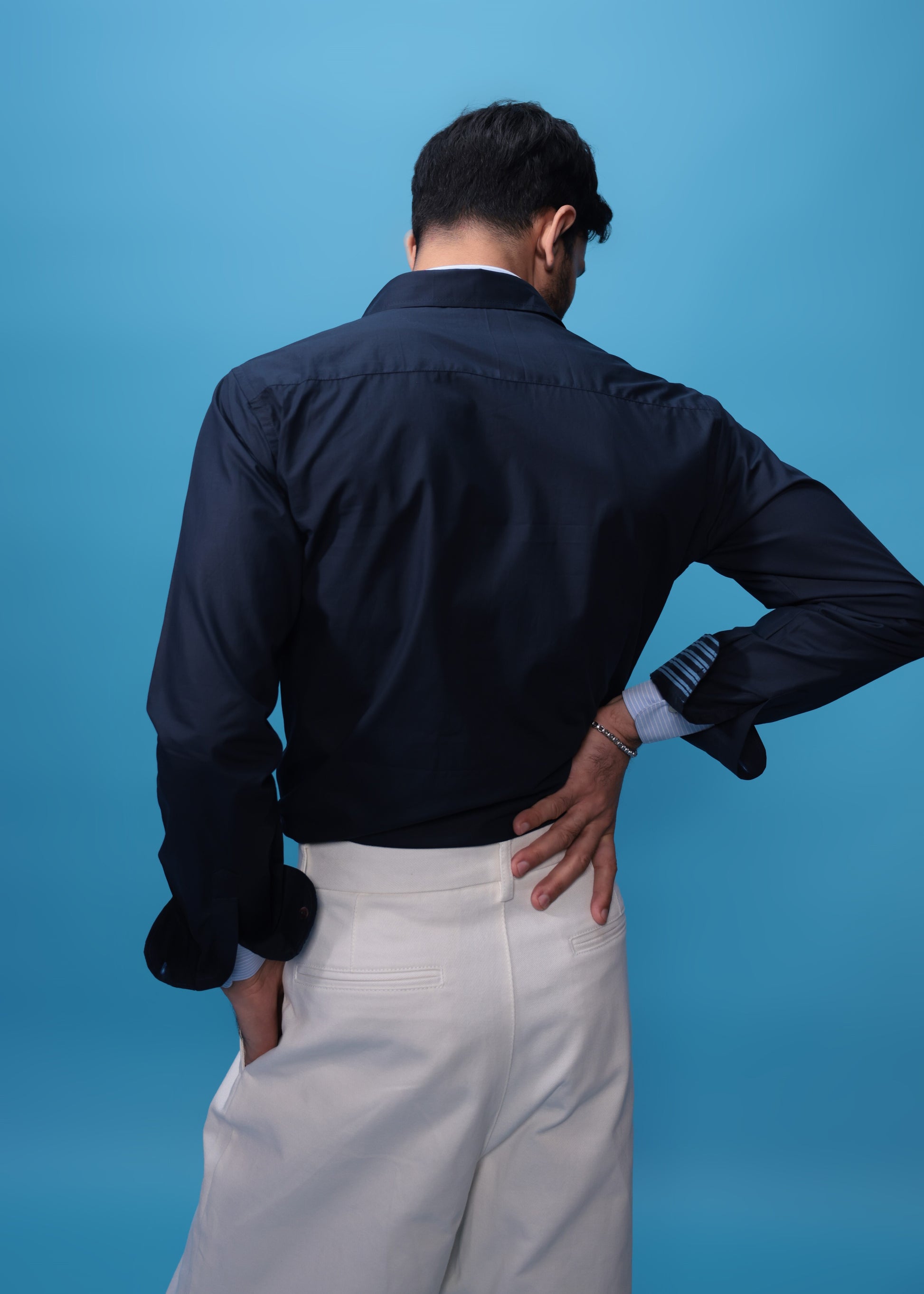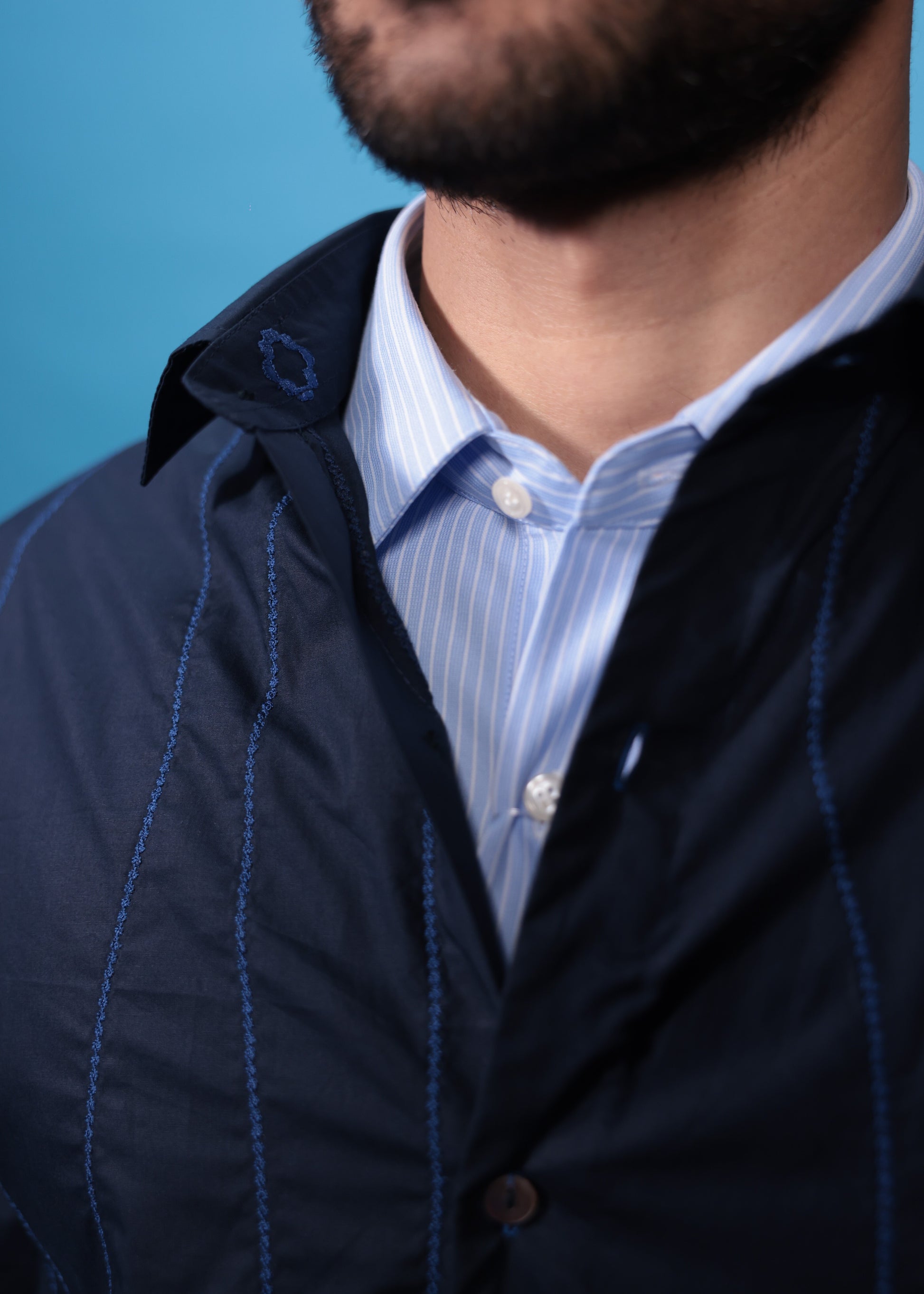Bold meets balance in the Cobalt Swirl Shirt, handcrafted in 35 man-hours from 100% Egyptian Giza cotton. Its rich navy tone evokes depth and elegance, while abstract embroidery and block-printed under the cuff add a refined edge. Finished with THE logo on inner neckband of the collar, it’s perfect for evenings that demand presence and style.