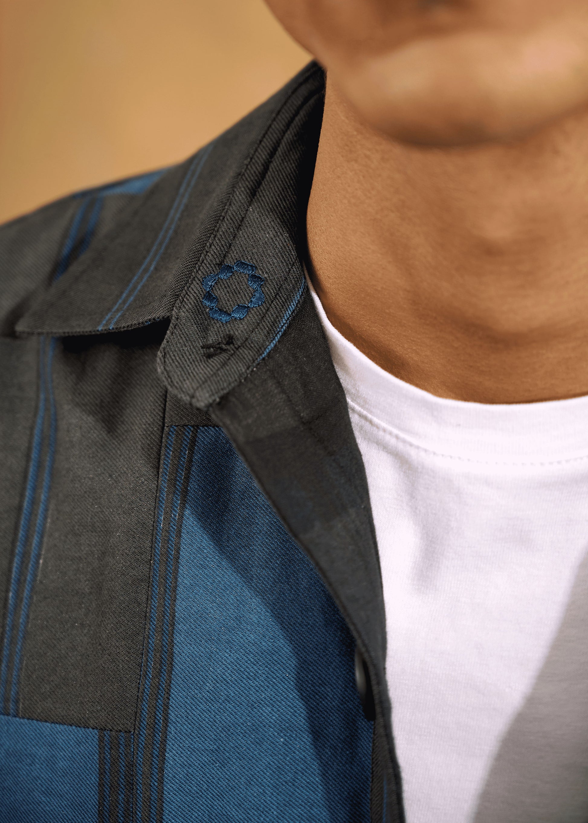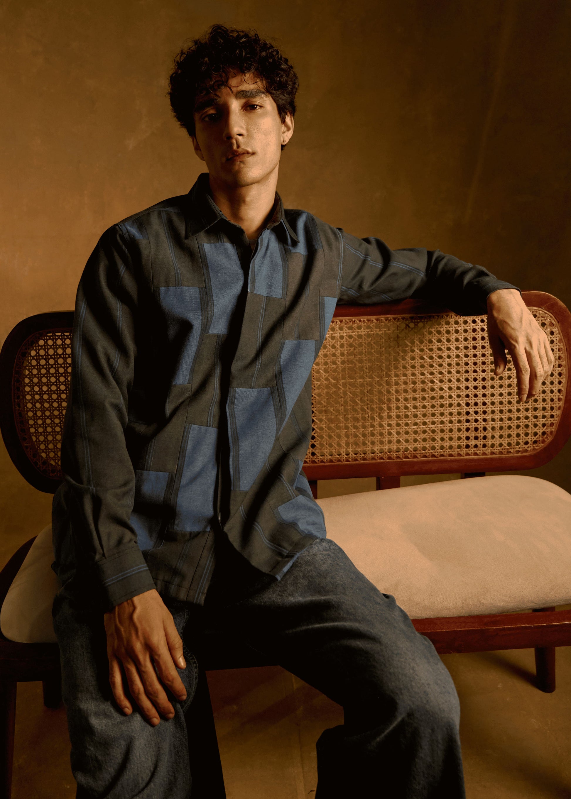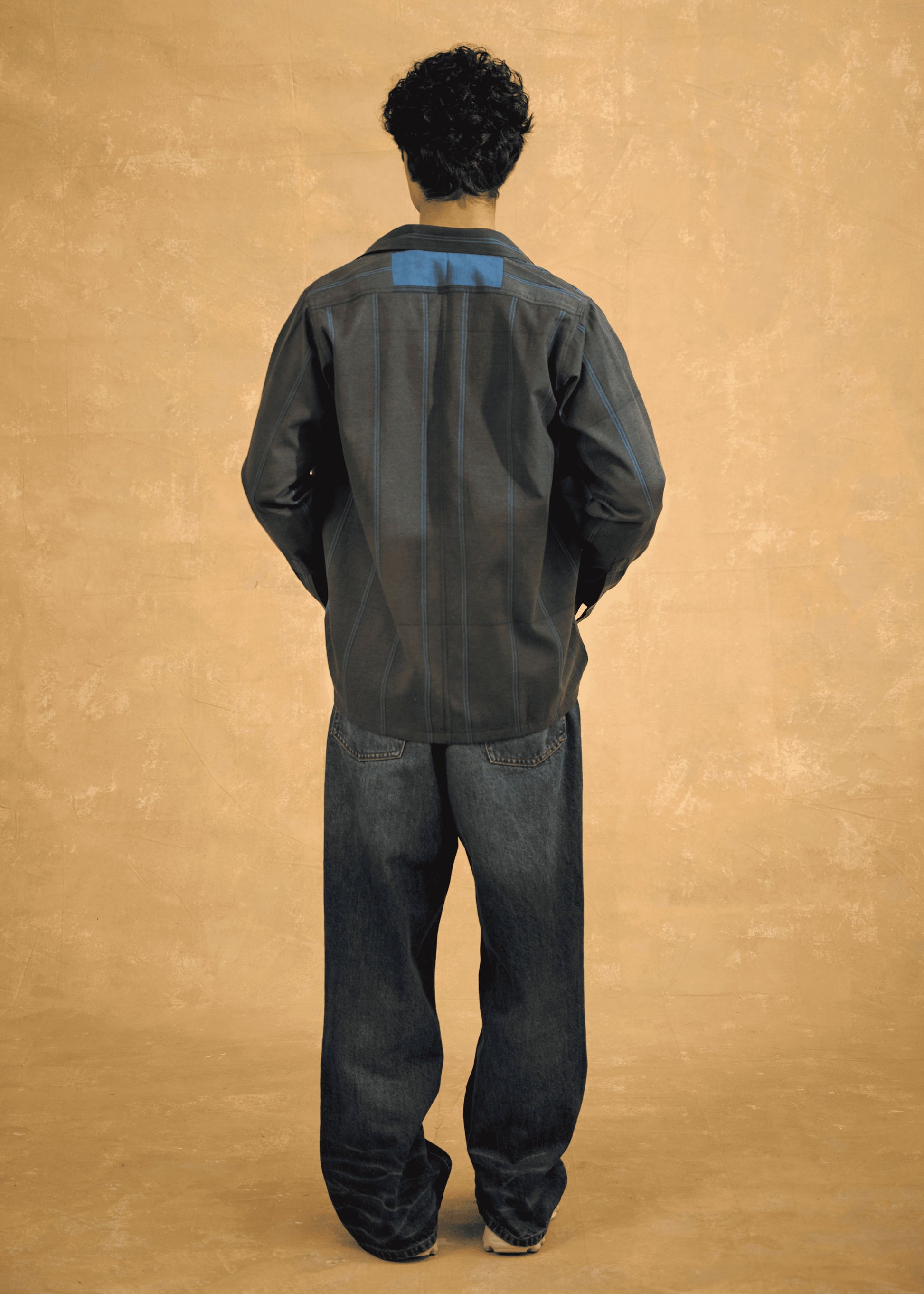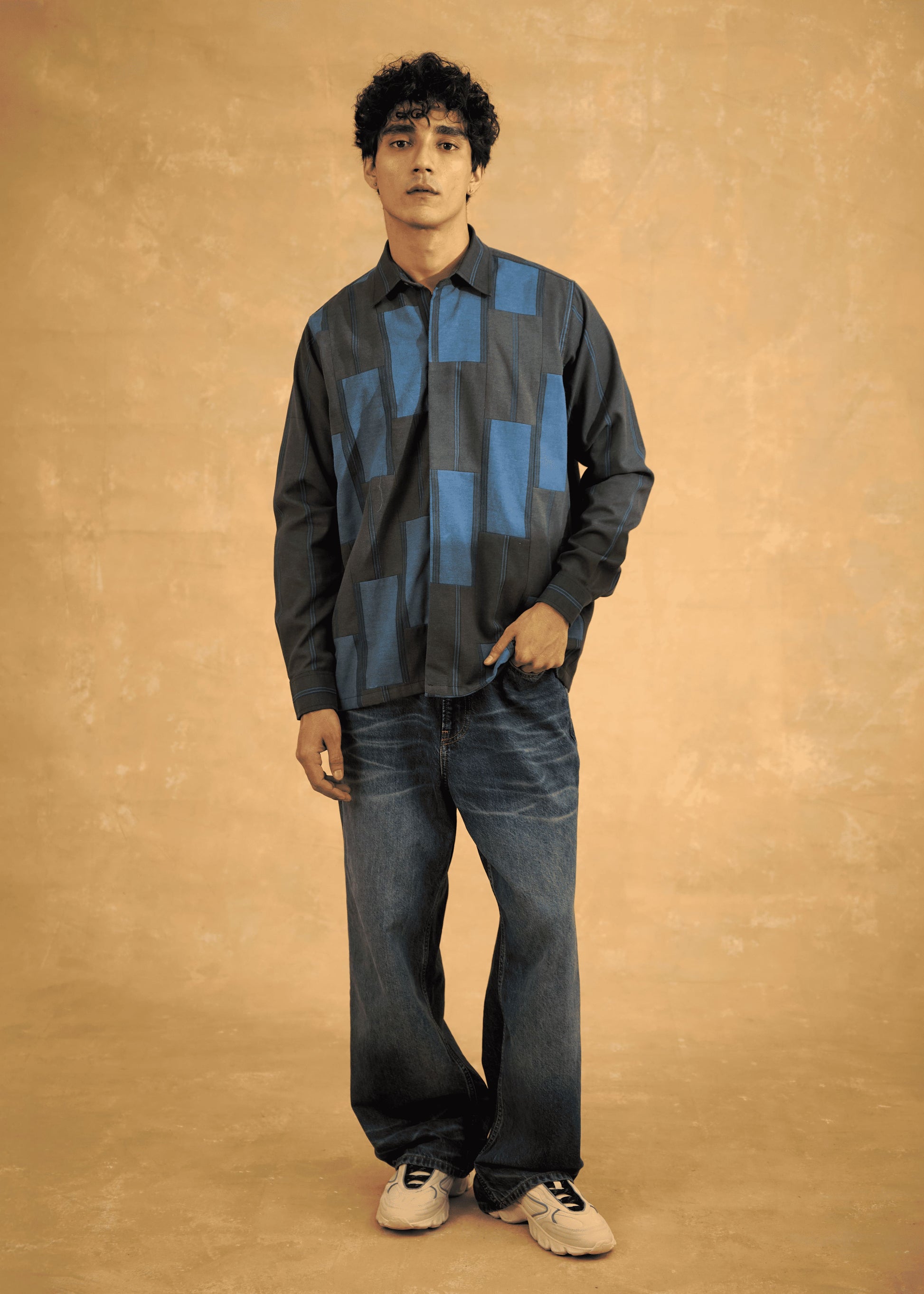 The Crestfall Prime Shacket is a refined expression of elevated craftsmanship, designed in deep tones of blue and grey with hand-screen-printed stripes and intricate patchwork detailing. It represents peak excellence, perfectly capturing the shacket’s dynamic textures and premium finish. This shacket stands as a statement of signature individuality, crafted for men who appreciate detail, distinction, and timeless sophistication.