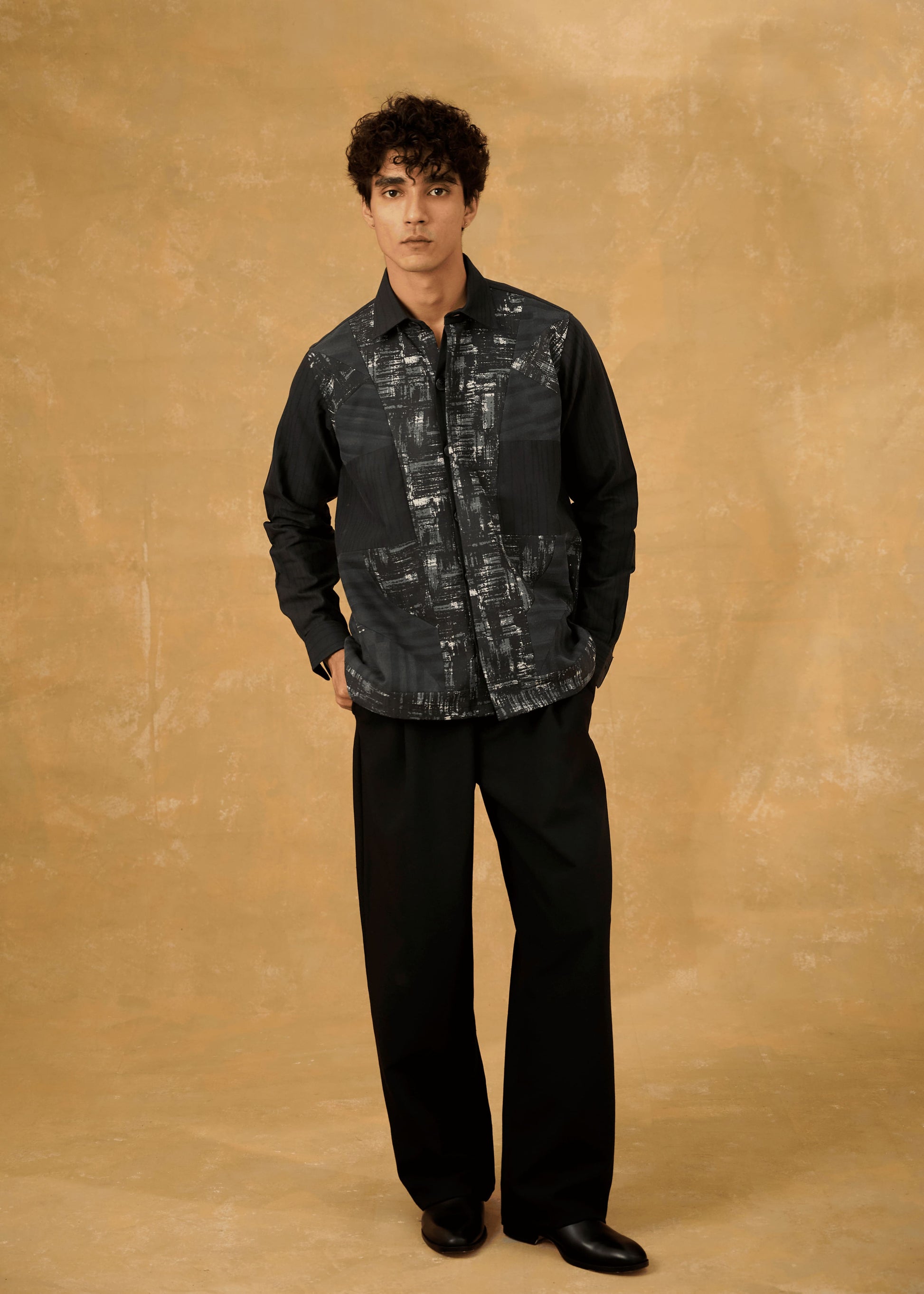 The Graphite Epitome Shacket captures the height of refined craftsmanship, blending dark grey and black tones through abstract and striped patchwork. Inspired by the depth and confidence of graphite, it reflects bold sophistication and modern artistry. Every panel is thoughtfully placed, creating a balanced structure that feels both expressive and timeless. As part of The Signature Series, it stands as the epitome of personal style crafted for men who appreciate detail, distinction, and effortless elegance.