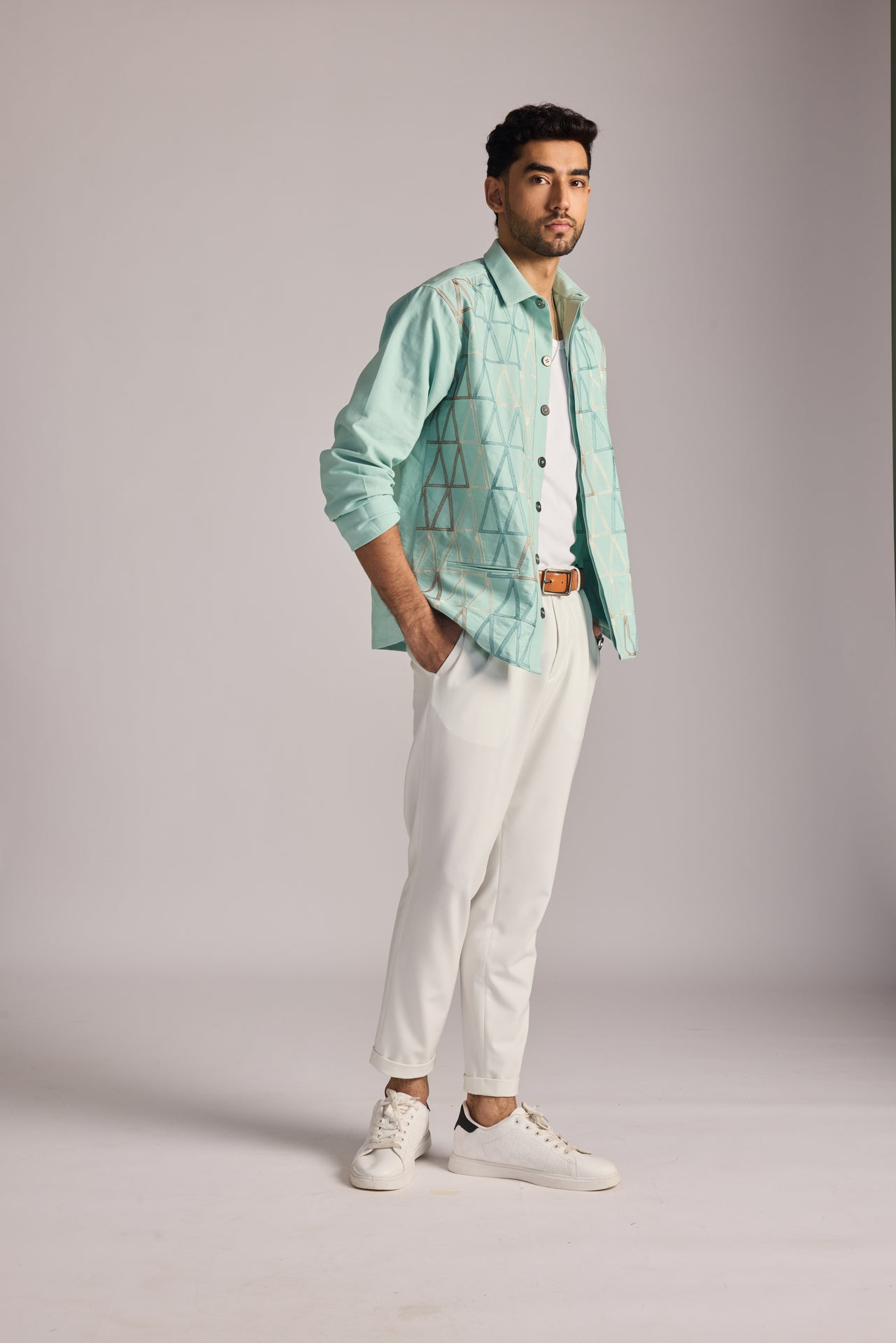 THE Matterhorn Blue Shacket crafted from recycled PET fabric is the best choice for you and our planet. Made from recycled plastic bottles, this shacket is fun, versatile, vividly interesting and eye-catching making it the best choice for occasion wear. The name captures the elegance and unique shape of the mountain, mirroring the triangle embroidery on the shacket and reflecting its refined light blue color.