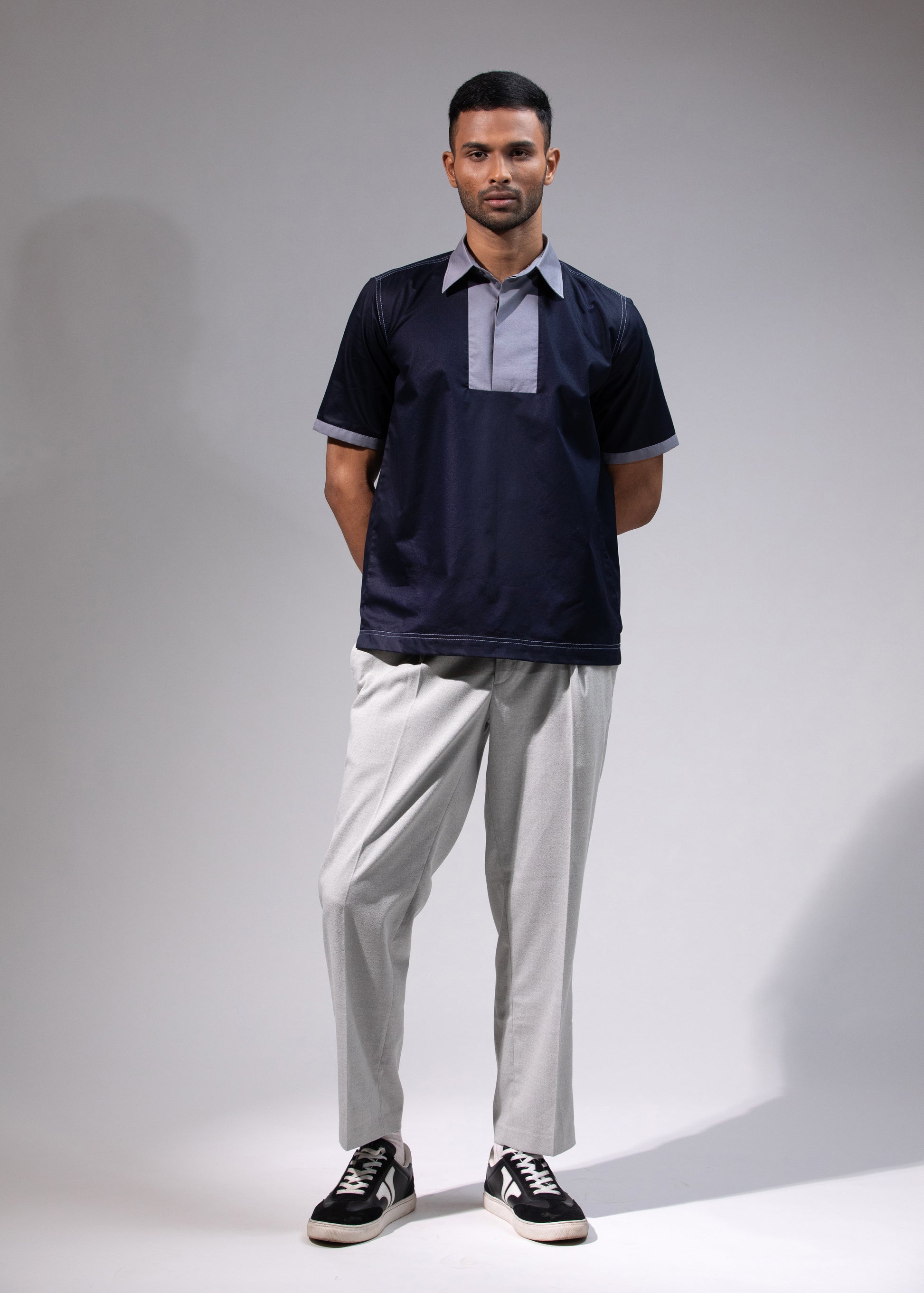 The Midweek Marina Polo Shirt, crafted from lustrous Egyptian Giza cotton, captures the subtle art of escape. The deep navy base mirrors the calm depths of the ocean, while the grey placket and collar draw inspiration from the understated elegance of coastal architecture. Designed with a clean half-sleeve silhouette, it embodies minimalism with quiet sophistication. Perfect for those spontaneous midweek breaks, it effortlessly transitions from structured mornings to soft moments by the water, making it as fitting for dockside drinks as it is for unplanned adventures.