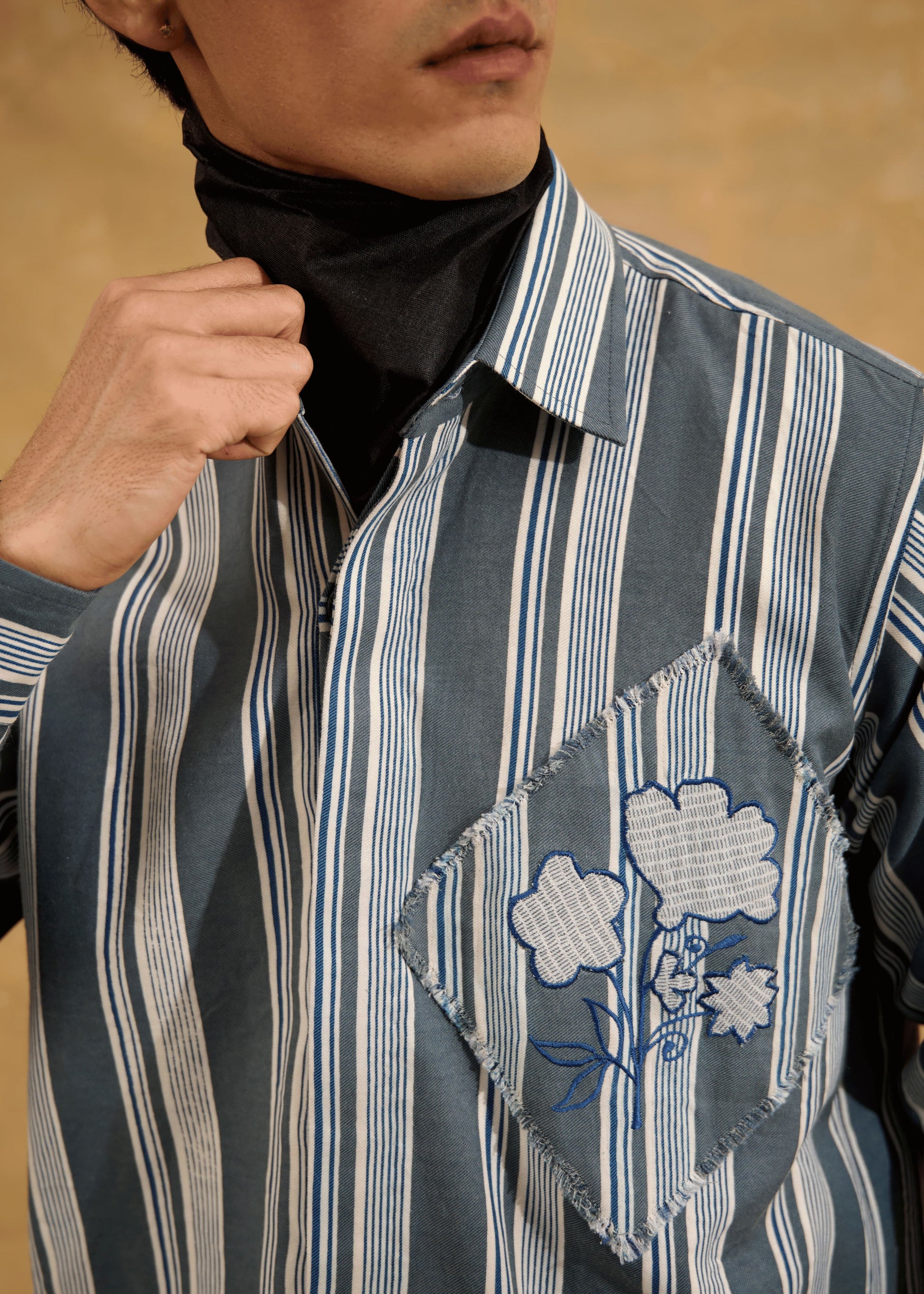 The Mosaic Canvas Shacket reflects the artistry behind its creation, where diagonal patchwork, dual grey tones, floral appliqué, and hand screen prints merge like pieces of a refined mosaic. The word 'Canvas' symbolizes the crafted foundation on which these techniques come together, turning the shacket into a wearable artwork.