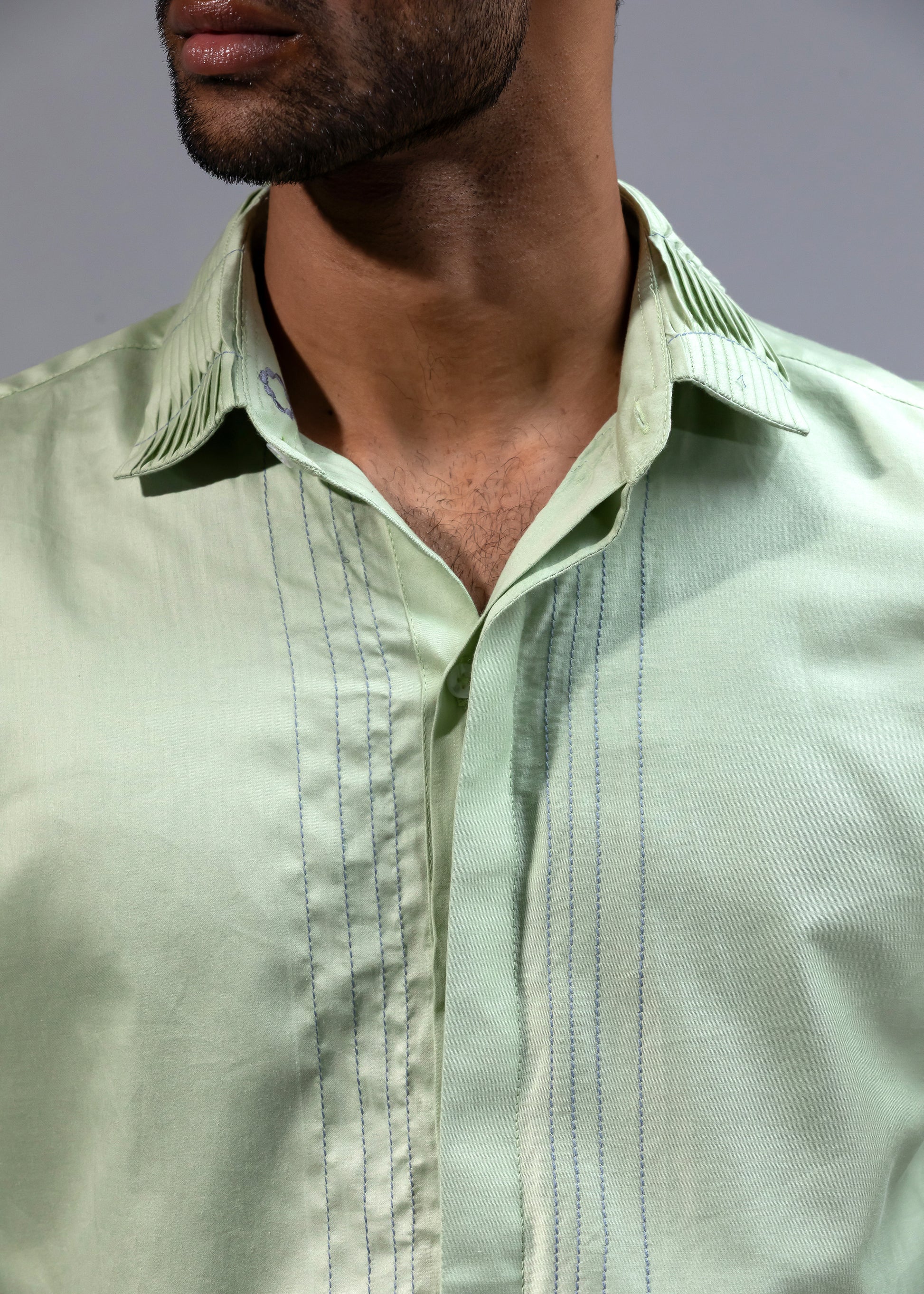 THE Slate Mist Shirt, crafted from a premium cotton-linen blend, draws inspiration from the grounding elegance of slate and the airy softness of morning mist. Its muted mint tone exudes a calming freshness, while the precisely tailored pintucks, subtle wave embroidery, and delicate stitch line on the collar add layers of quiet sophistication. Balancing structure with ease, this shirt transitions effortlessly from a polished lunch meeting to a serene coastal evening, embodying understated luxury for moments when you step away with style.